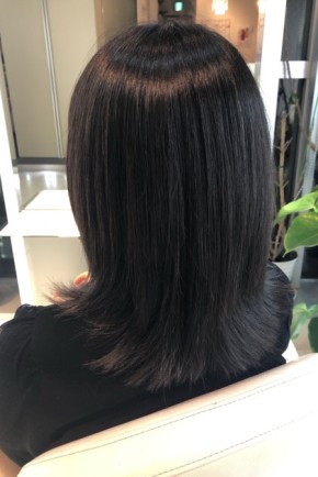 ちょうど肩に沿い動く毛先は、オージュアトリートメント、クエンチで水分バランスを整えしっとりツヤ髪に☆
